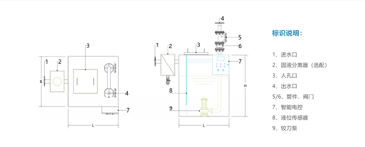 HWT-TS污水提升設備針對地下室或不能同層直接排水的場所,用于廚房或污水中不含大順粒雜物污水的二次提升,設備采用不銹鋼箱體;由兩臺(一用一備)鉸刀泵; 3+1液位控制系統(tǒng);智能控制箱組成。