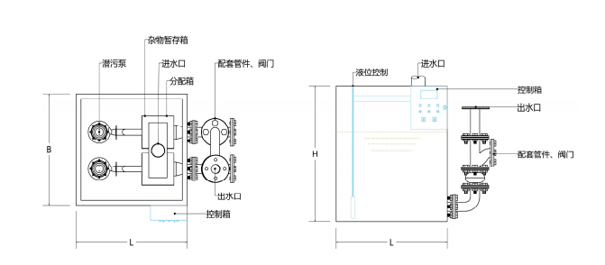 HWT-FC sewage lifting equipment is a highly integrated sewage discharge system, which collects sewage and wastewater lower than the system pipe network through the water collecting tank and lifts it to the outdoor drainage pipe network by using the lifting pump. It consists of a water collecting tank, a temporary storage box for sundries, a sewage pump, an automatic level gauge and an electrical control device. At first, sundries are trapped in the slag temporary storage box, and the filtered sewage flows into the water collecting tank. When the liquid level in the water collecting tank reaches the starting liquid level, the sundries intercepted in the sundries temporary storage box are reversely discharged into the outdoor pipe network when the water pump starts. Applicable to: toilet sewage, rainwater, catering industry, entertainment industry, leisure service industry, construction engineering, commercial engineering, chemical plant, production and processing plant, pharmaceutical factory, hospital, municipal engineering and other underground sewage secondary lifting systems.